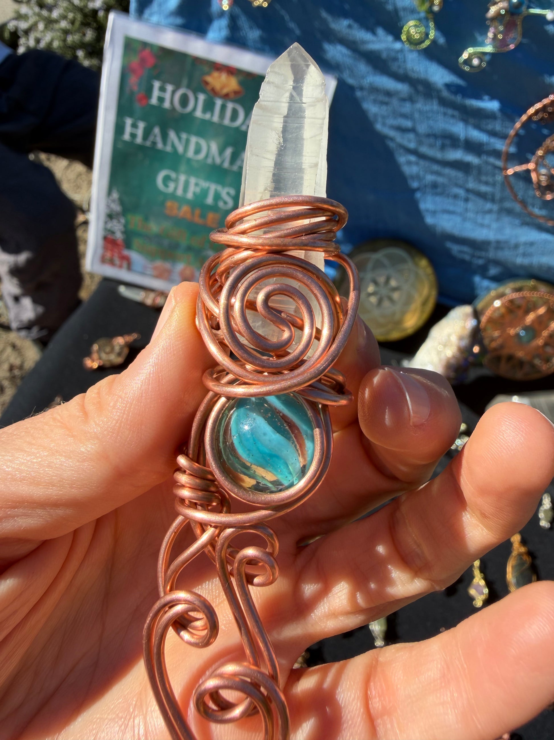 Hand-Wrapped Copper • Phantom Quartz Tip • Blue Antique Marble Core