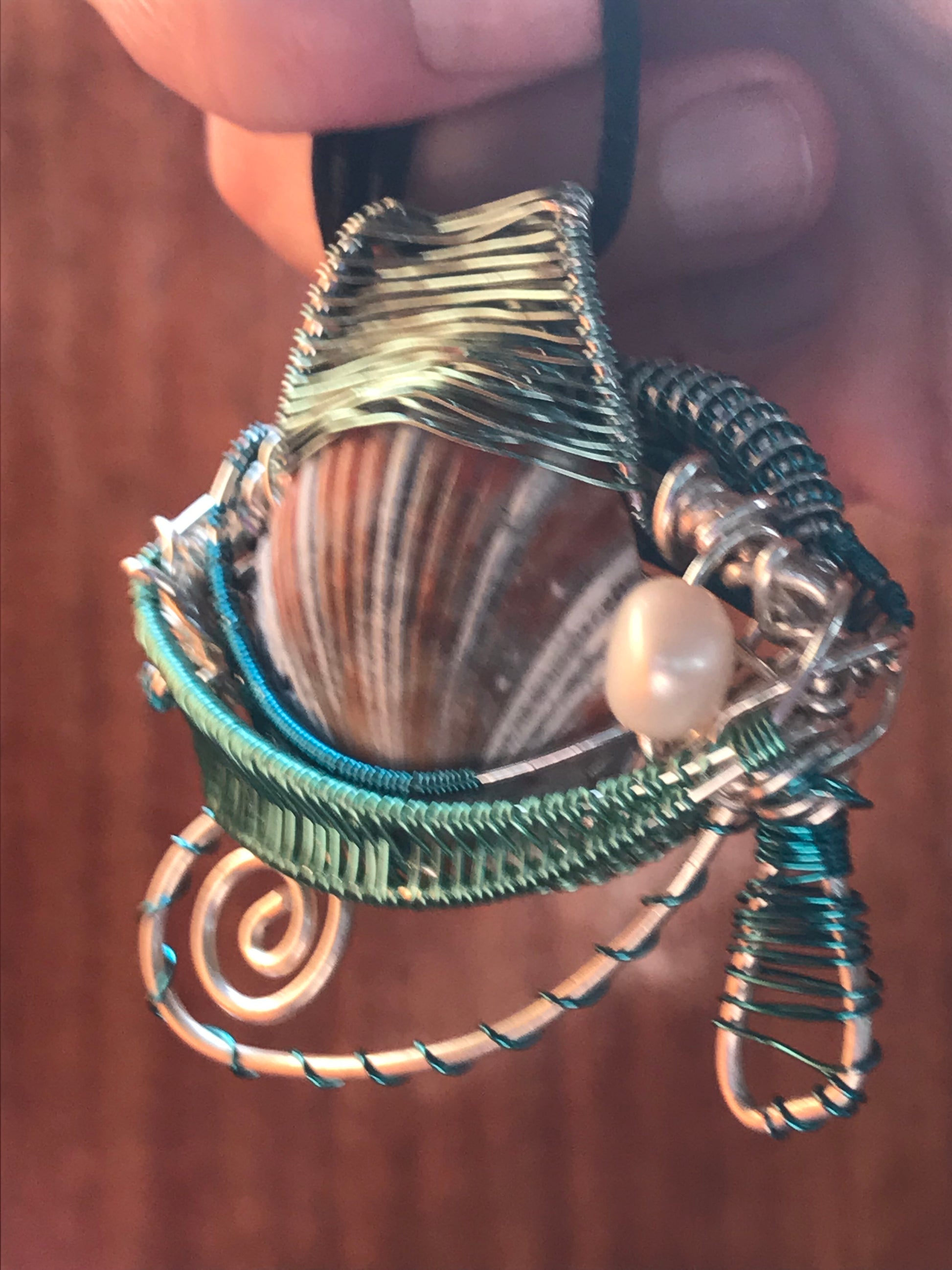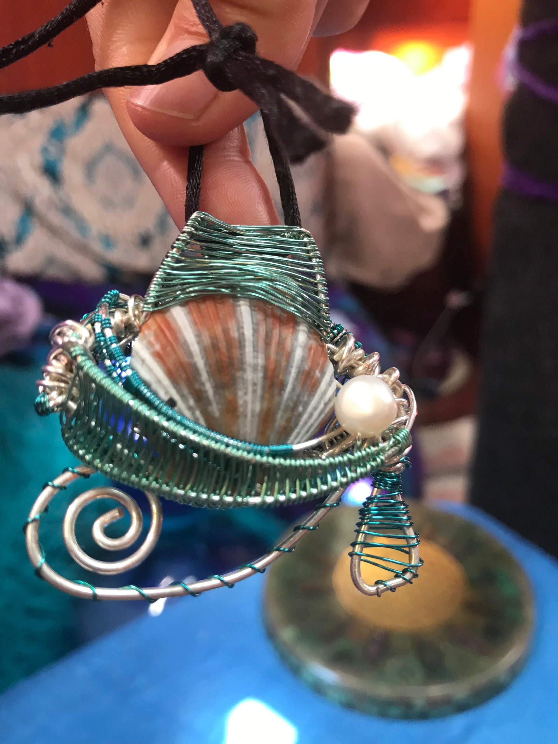 This all seeing eye was handcrafted in weaved by Majestic that I is made out of resin with a light and dark blue colors all wire is non-tarnish colorful copper coated wire colors of baby blue, sea foam  silver & blue. On the back there is a beautiful shell from siesta key Florida star gate bitch and a pearl.