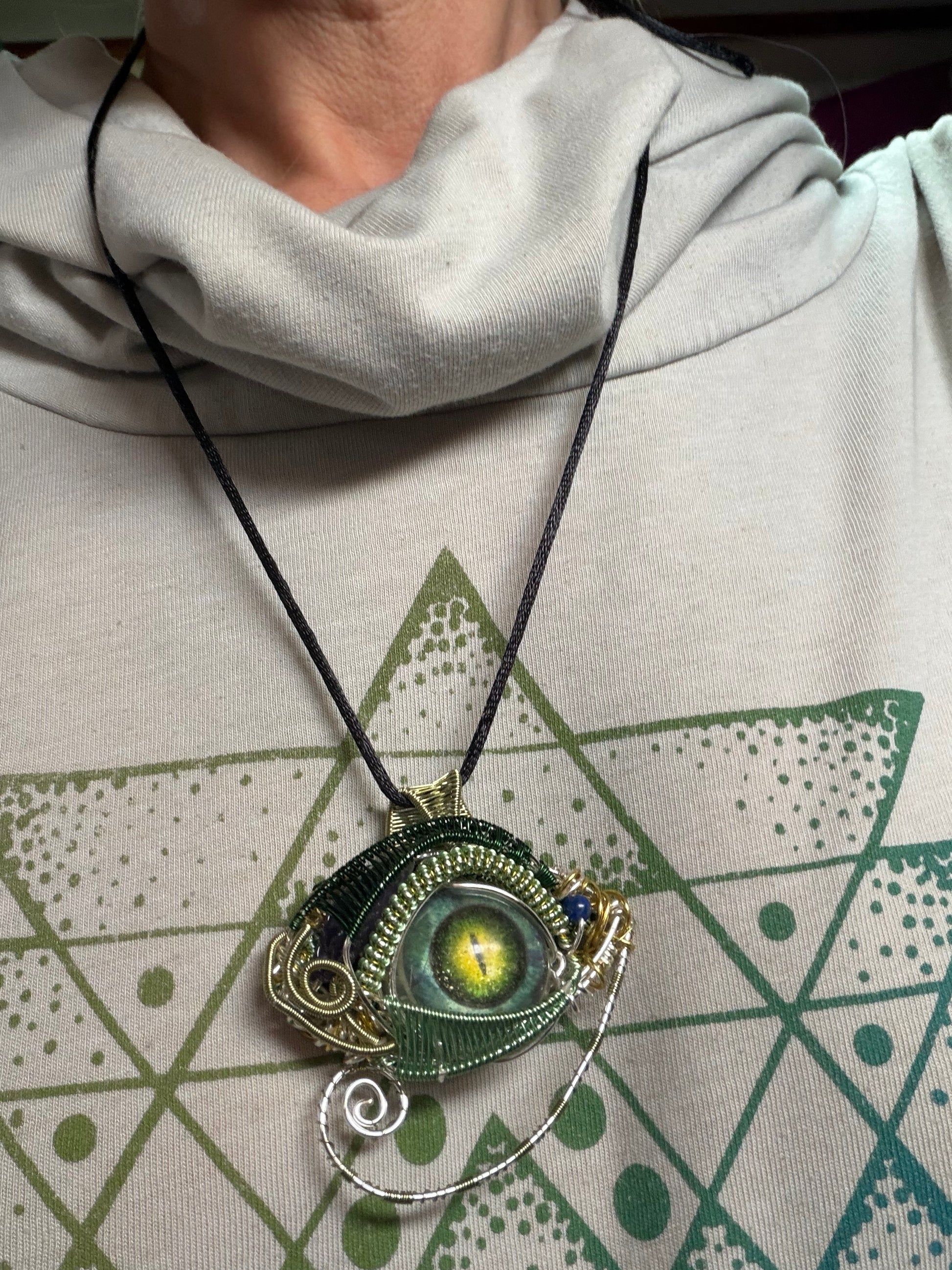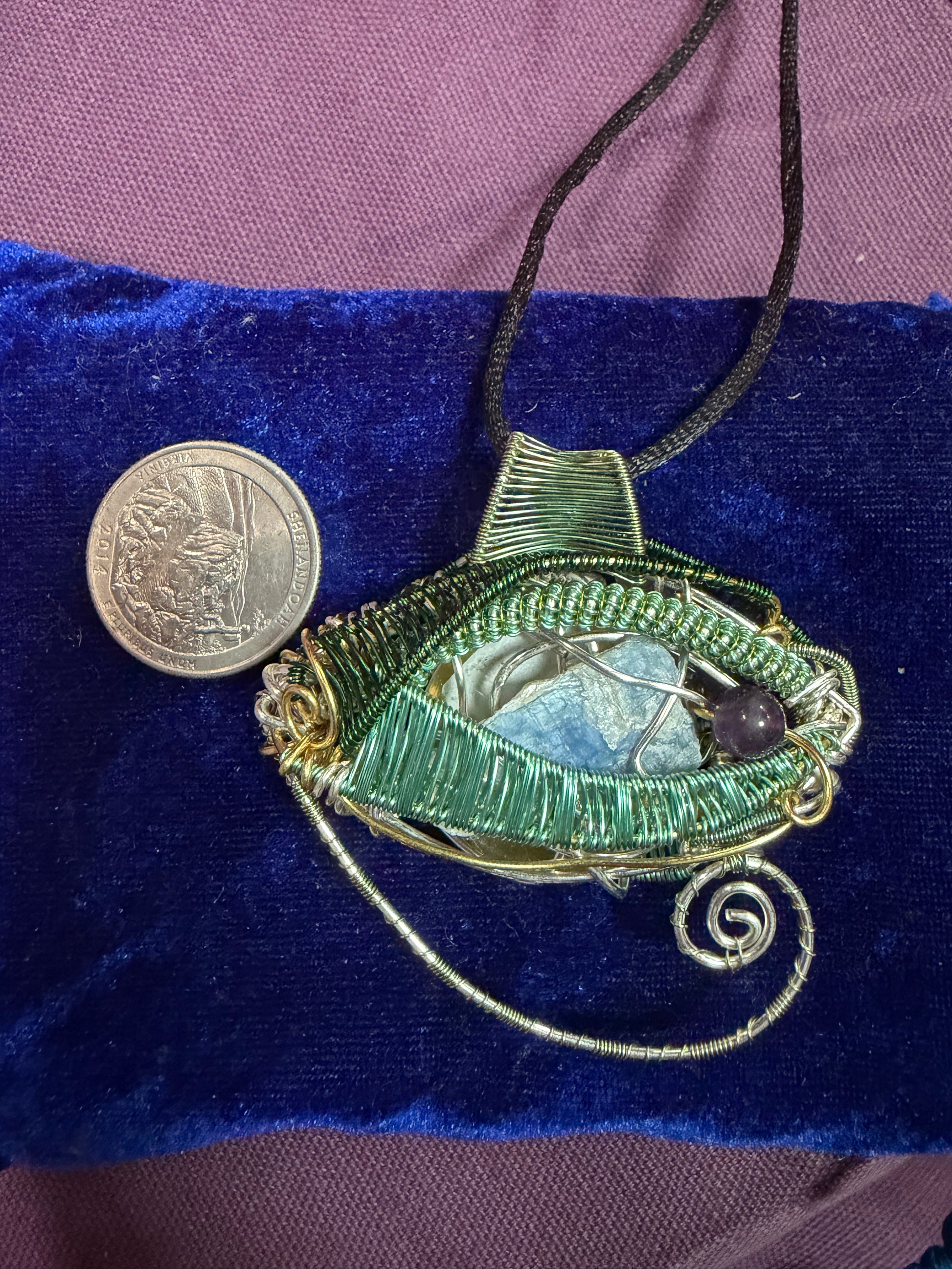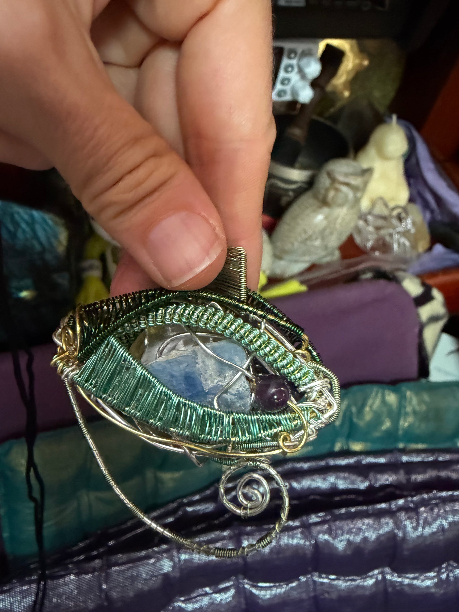 This was handcrafted and weave with colorful copper wire forest, green foam green baby blue, silver, and brass on the back. It has a blue kyanite and an amethyst on the front. It has an amethyst and a blue lapis. The eye is a picture of a frog‘s eye put into resin.