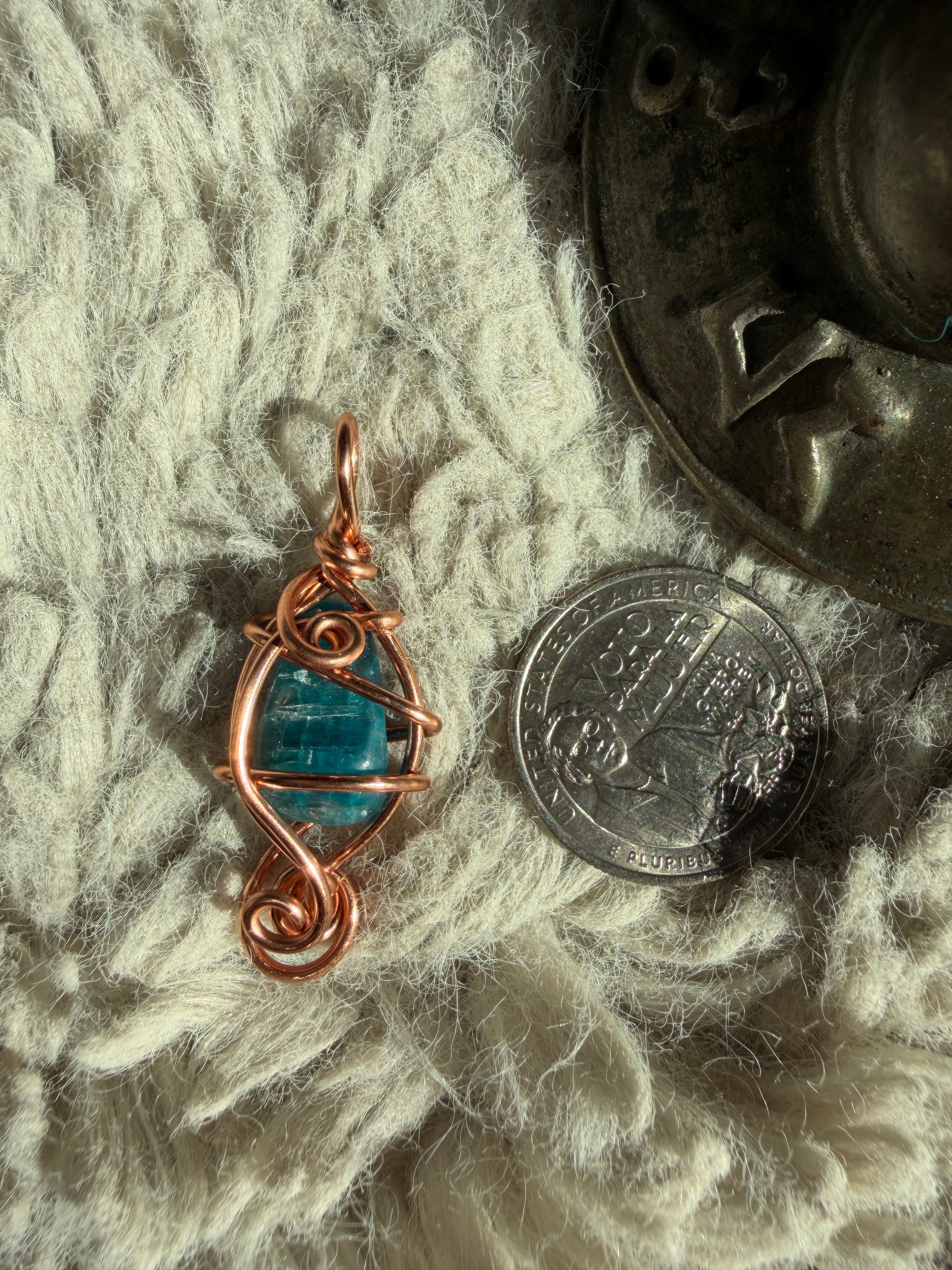 This striking Blue Apatite crystal is skillfully hand-wrapped in pure copper wire. The warm, earthy tone of natural copper enhances the stone’s deep blue vibrancy, creating a grounding yet energizing piece. Copper is known for its conductive qualities, both physically and symbolically, making this pendant ideal for those seeking amplified energetic flow.