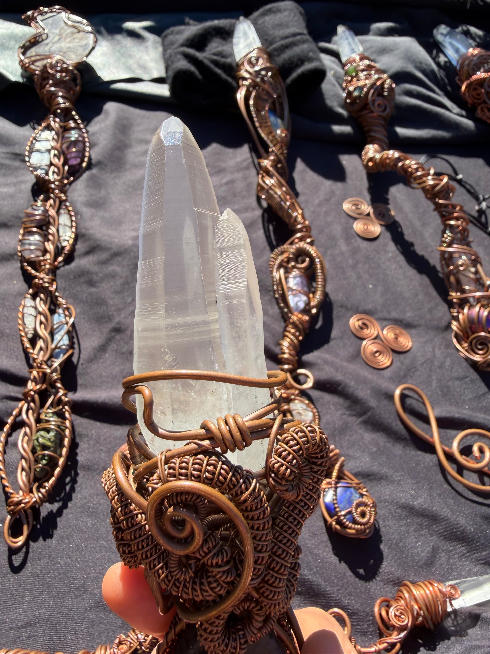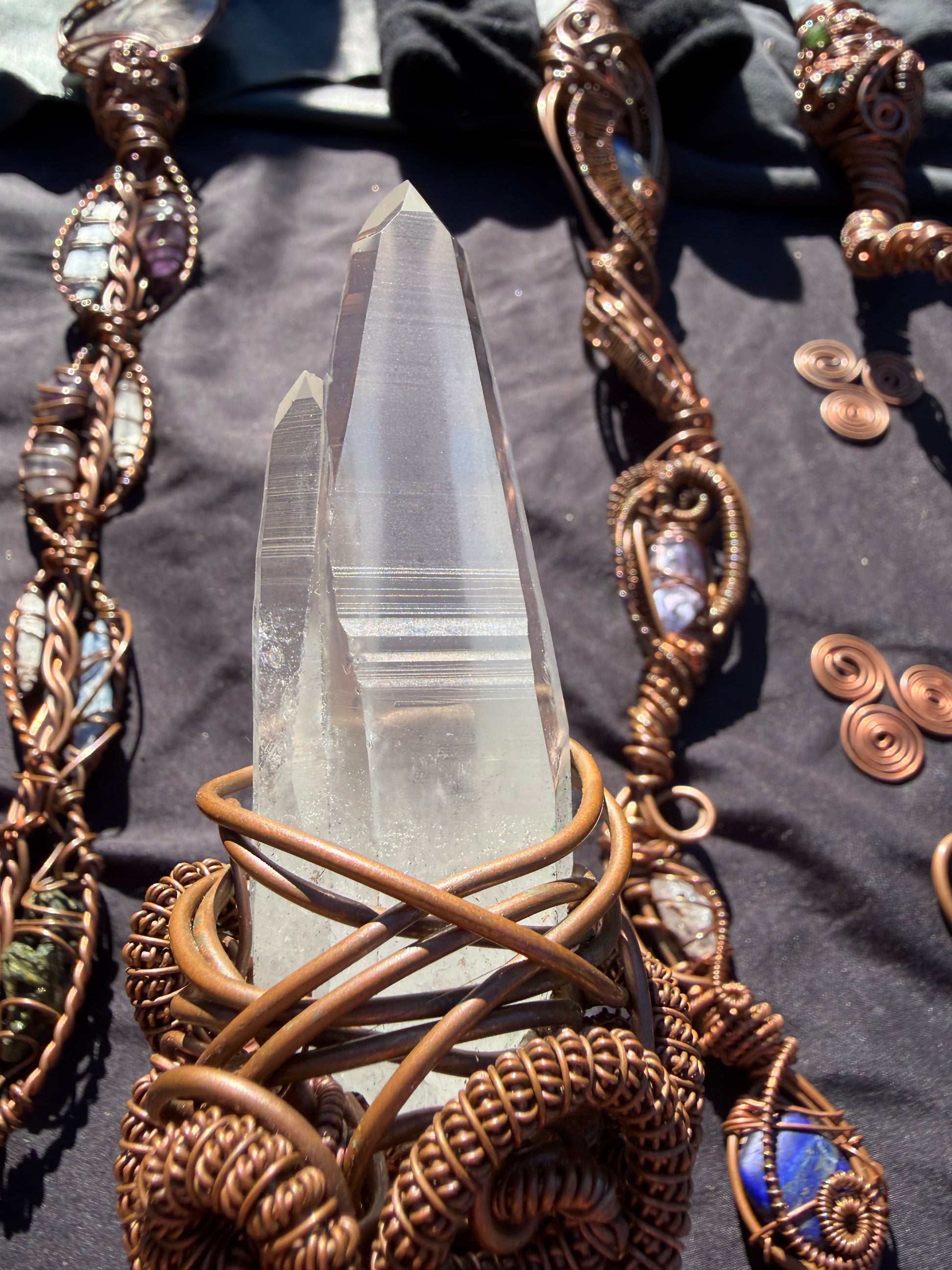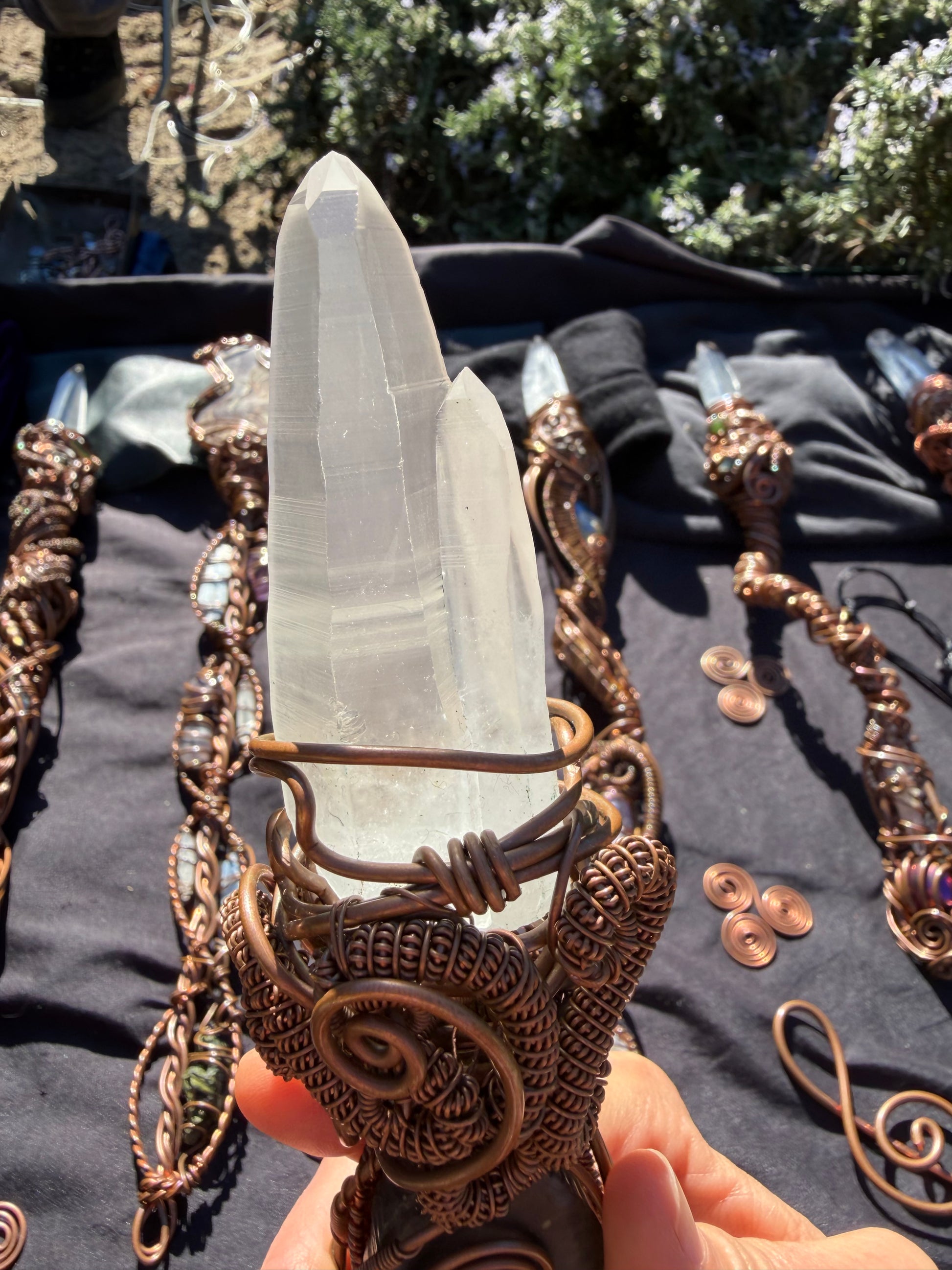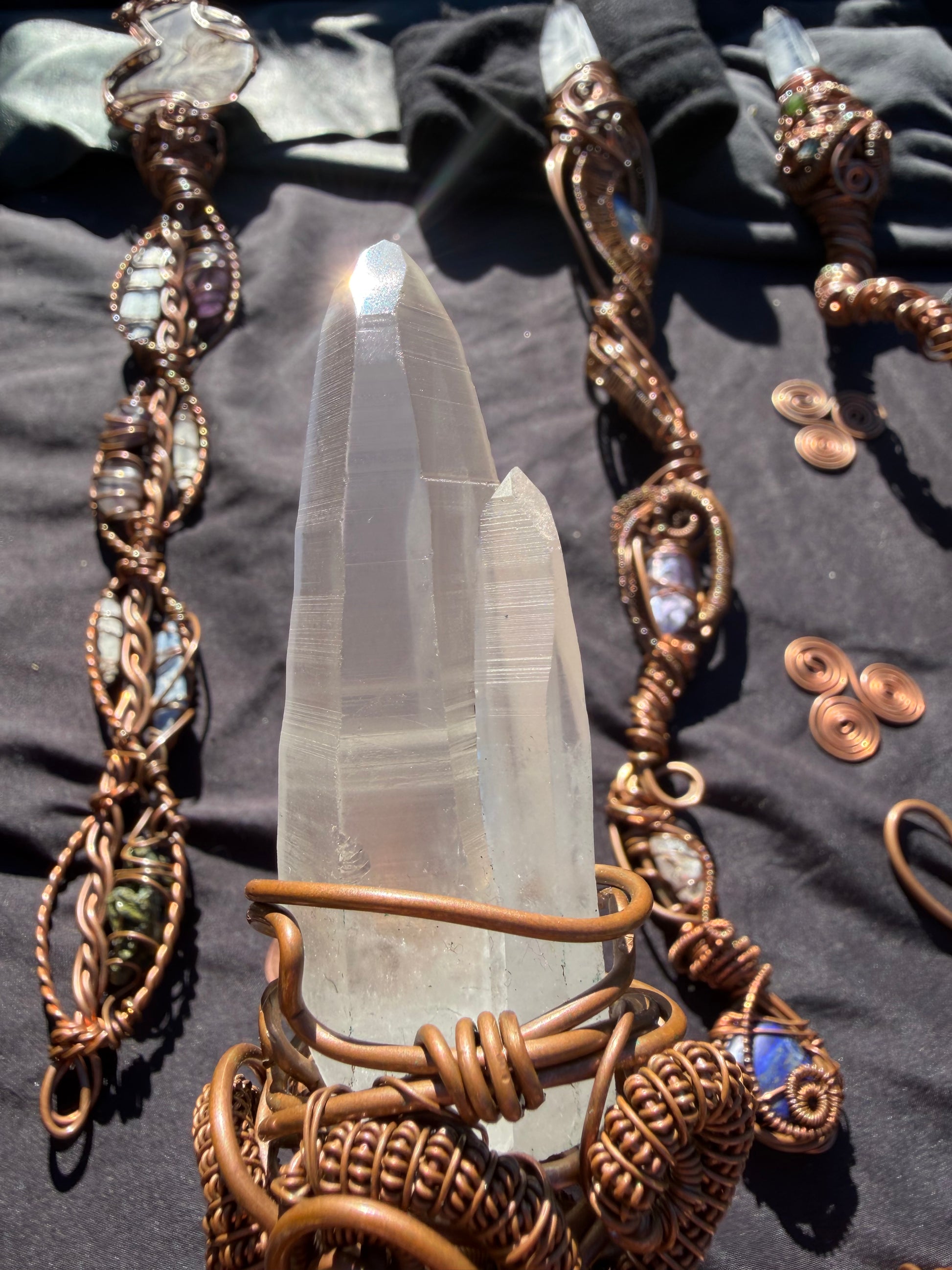 At the tip of the wand sits a Lemurian Twin Quartz, a crystal formation where two beings grew as one—two separate spirits, one single mission.