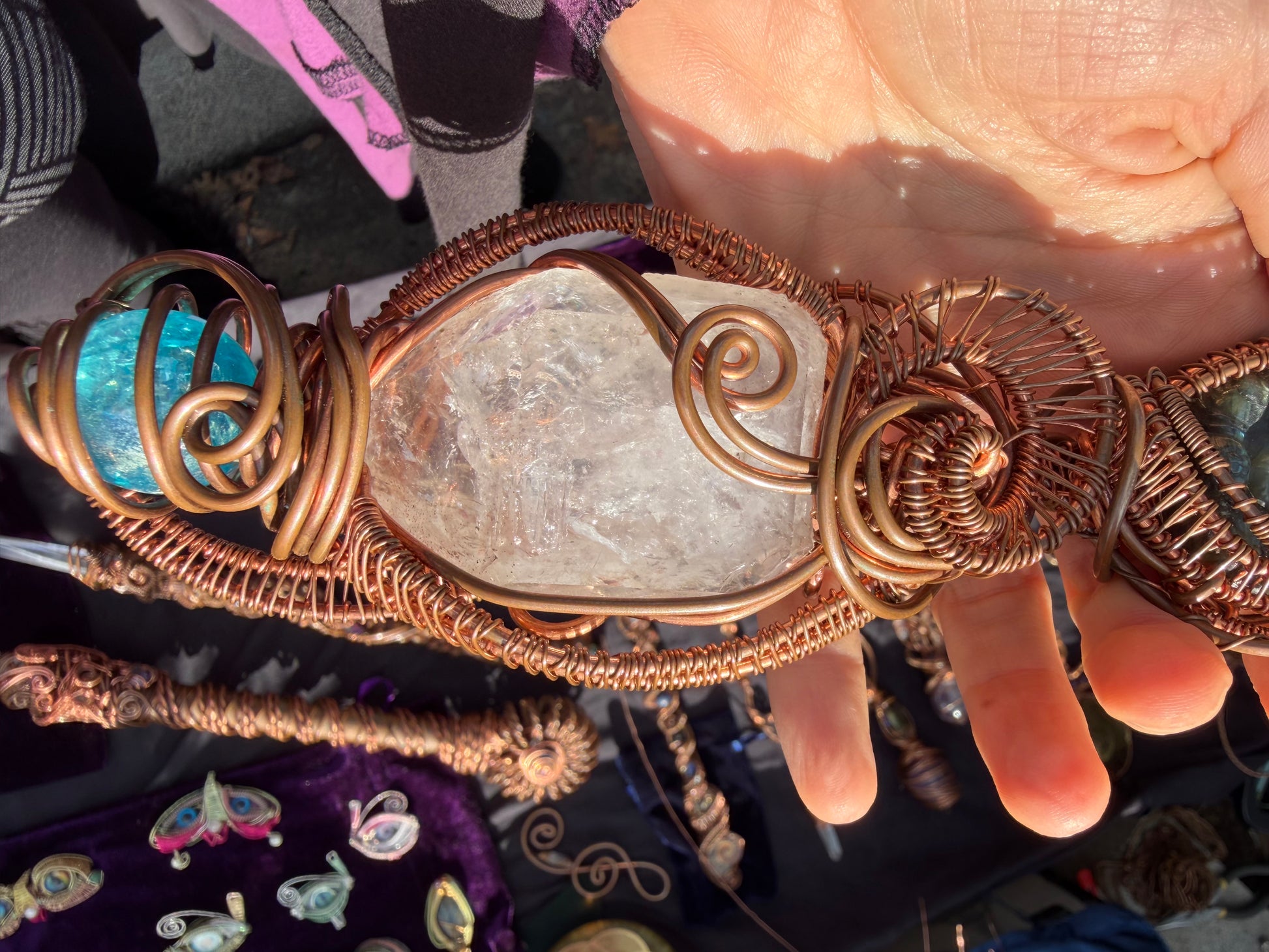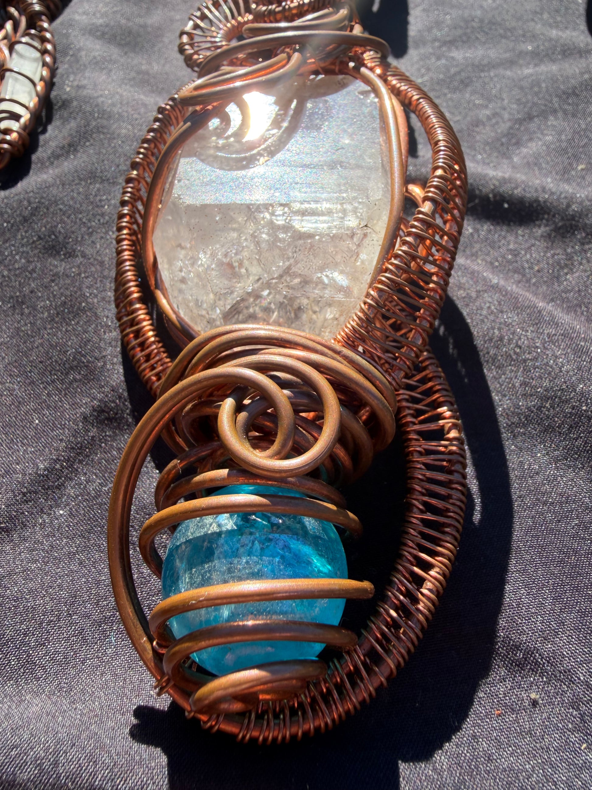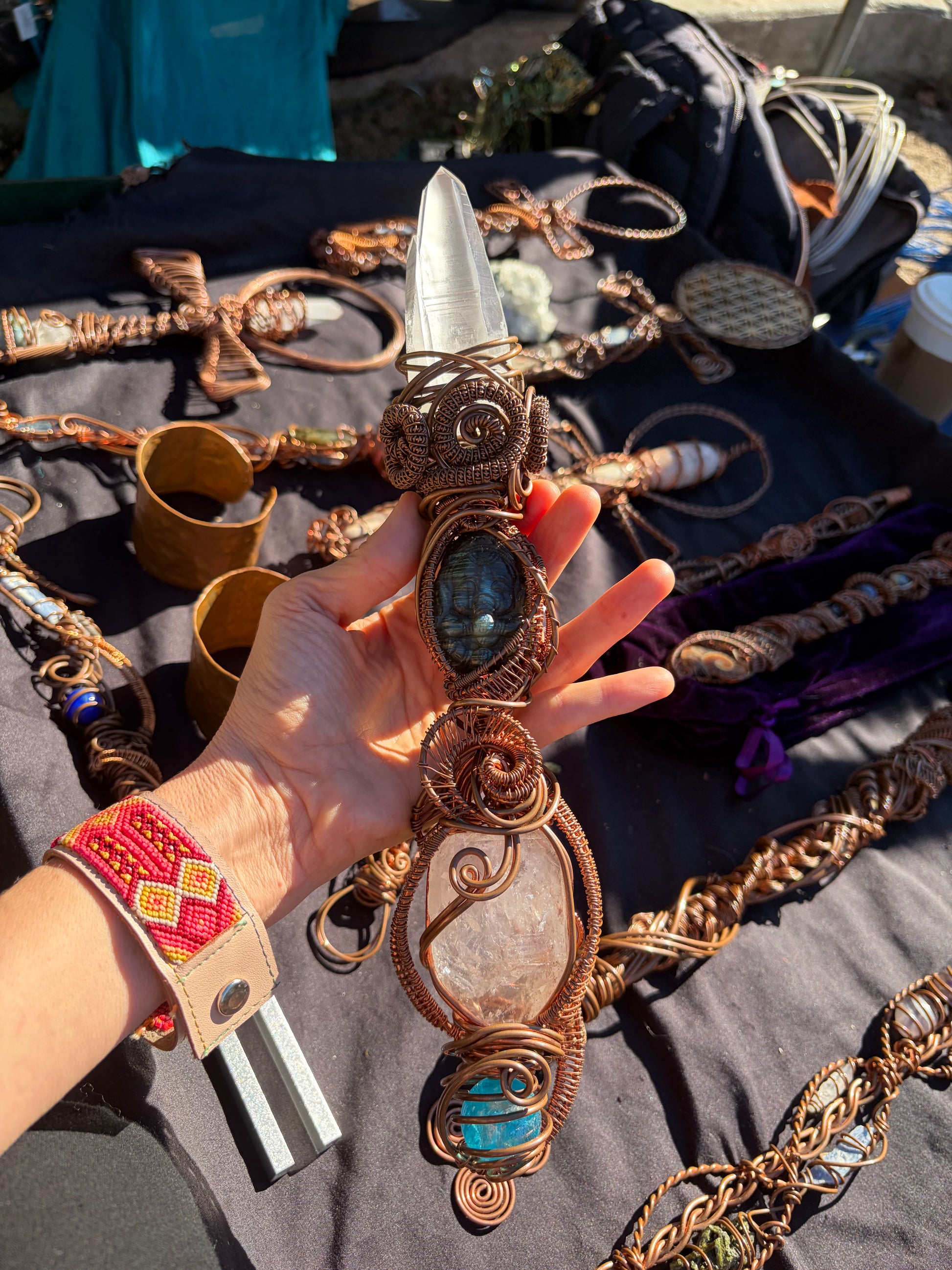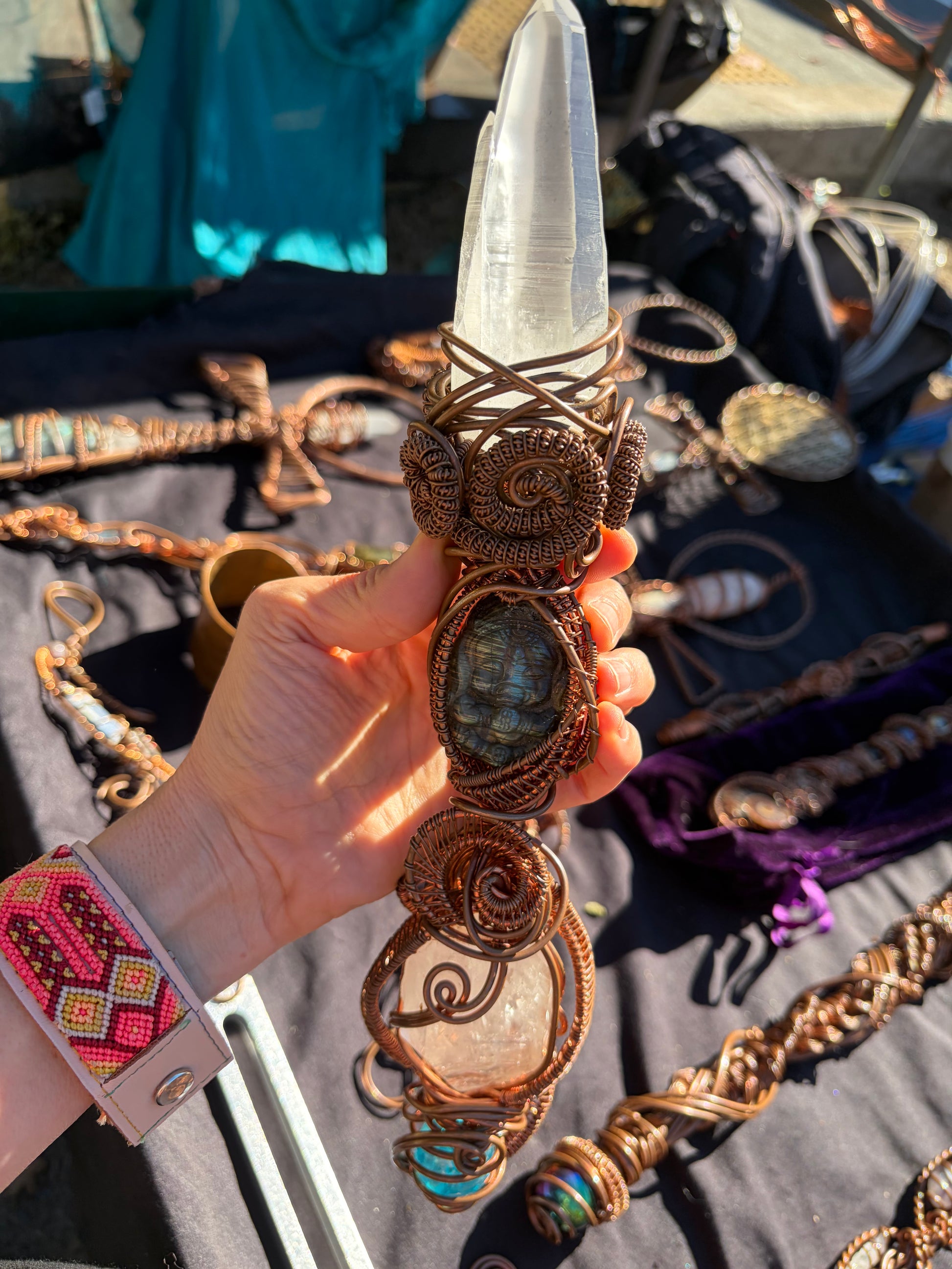 A powerful alignment wand featuring Lemurian Twin Quartz, a labradorite baby elephant (Ganesh totem), a rainbow Payson Diamond dug fresh from Arizona Earth, and an Aqua Aura sphere. Designed to remove obstacles, awaken intuition, ground clarity, and illuminate the path ahead.