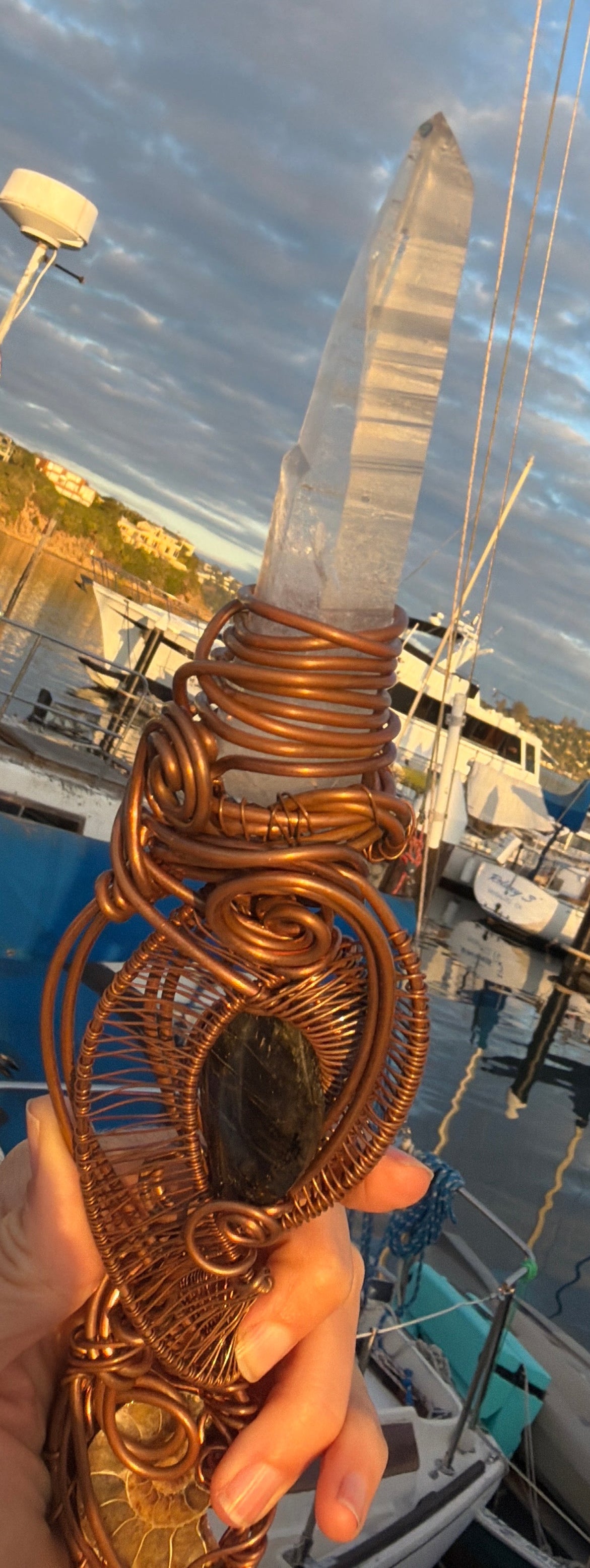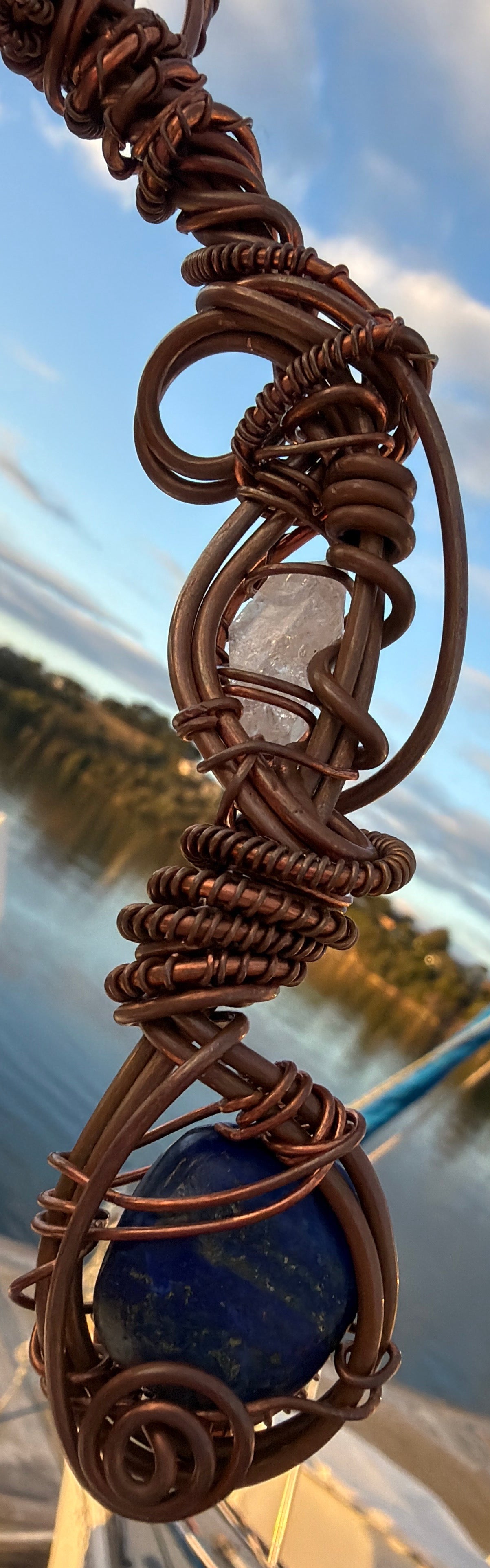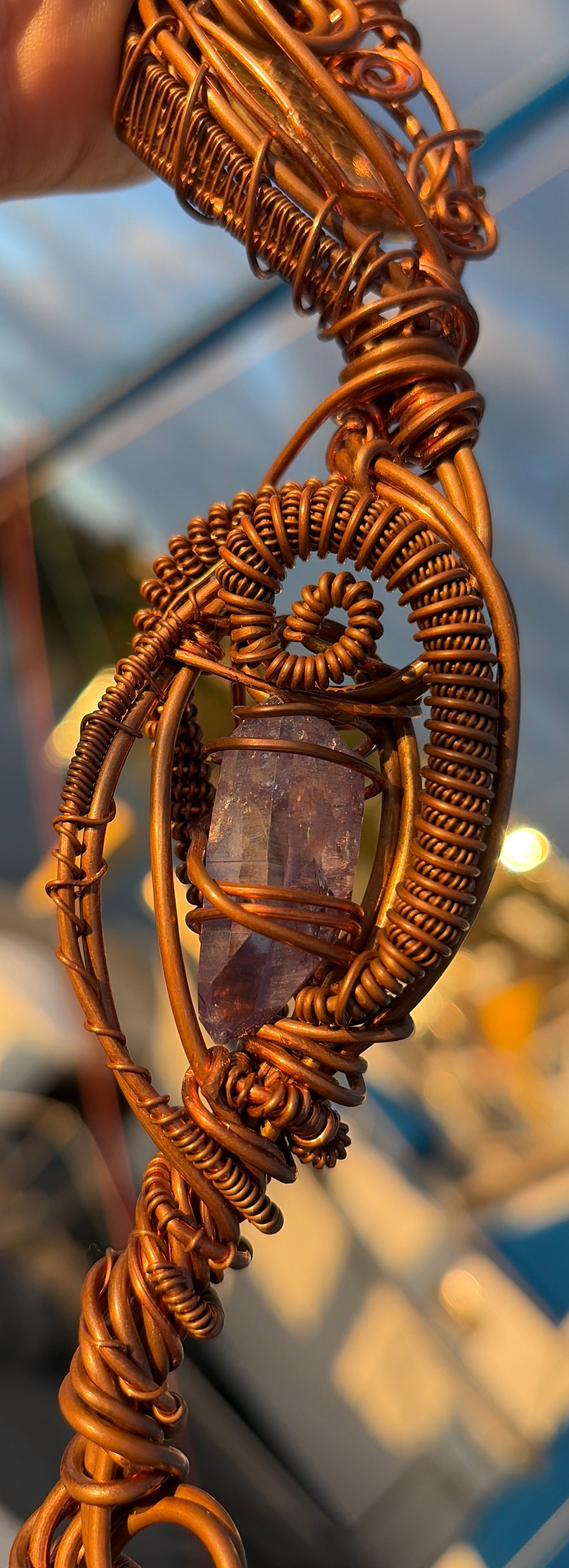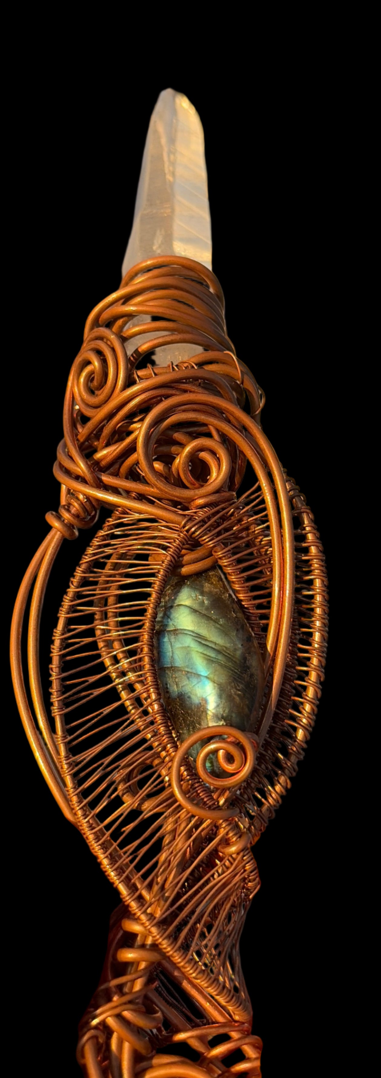 Forged by hand beneath the whisper of mountain winds, this wand carries the living memory of starlight meeting Earth. Every coil of copper is encoded with sacred numbers and harmonic intention  an alchemy of geometry, mineral intelligence, and divine remembrance.