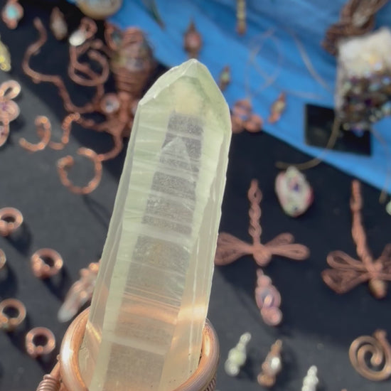 At the apex, the Lemurian Phantom Quartz amplifies the spiral’s ascension, pulling energy through the copper like a breath through a flute.