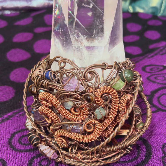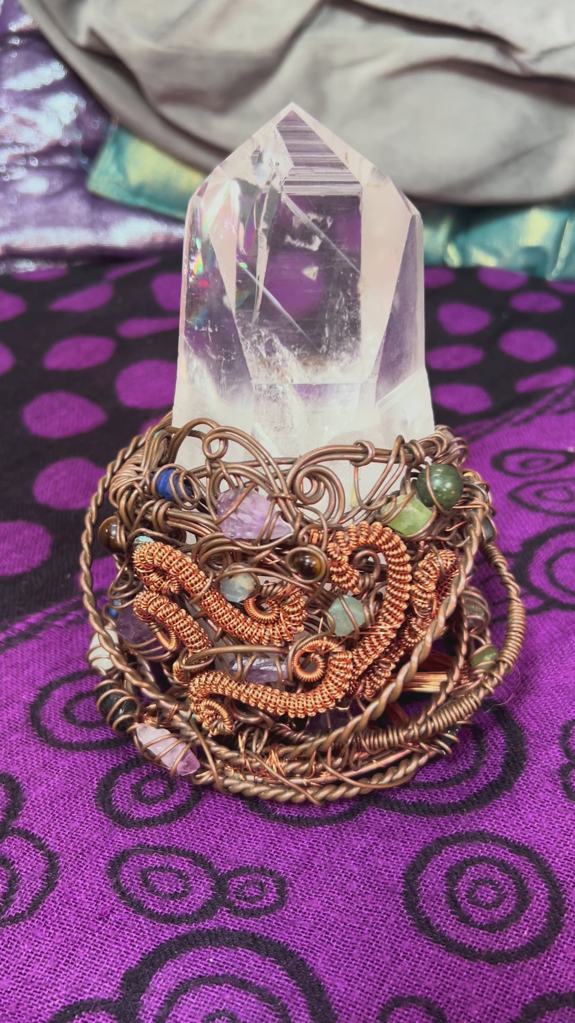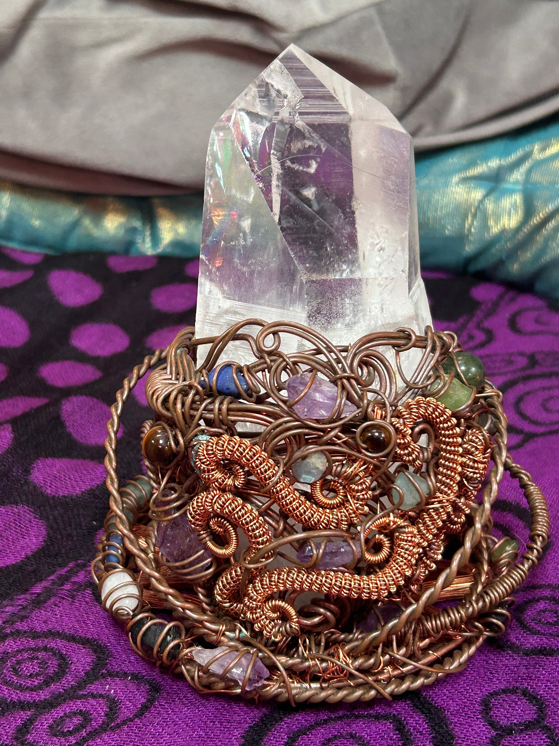 Infused with amethyst, tiger’s eye, aquamarine, labradorite, lapis lazuli, sungate, moonstone, apatite, malachite, and prehnite, every stone works together as a council of allies. Wrapped in 212 starship coils carrying the 0124875–369 by design energy, this piece is both ancient and futuristic—an anchor for manifestation and a portal to higher dimensional creation.