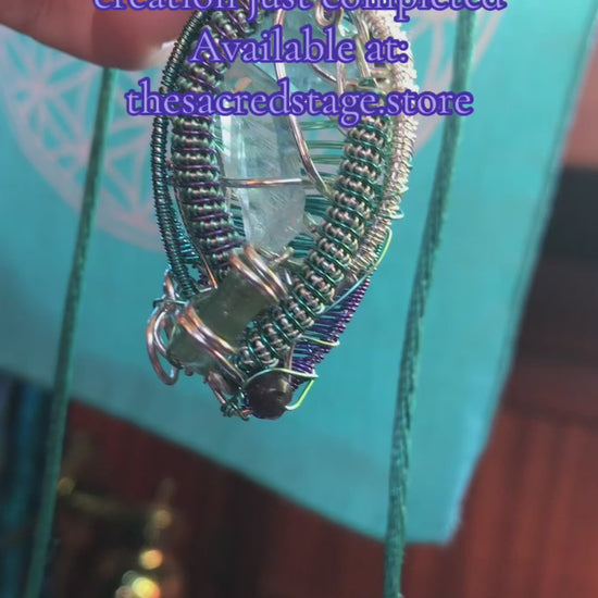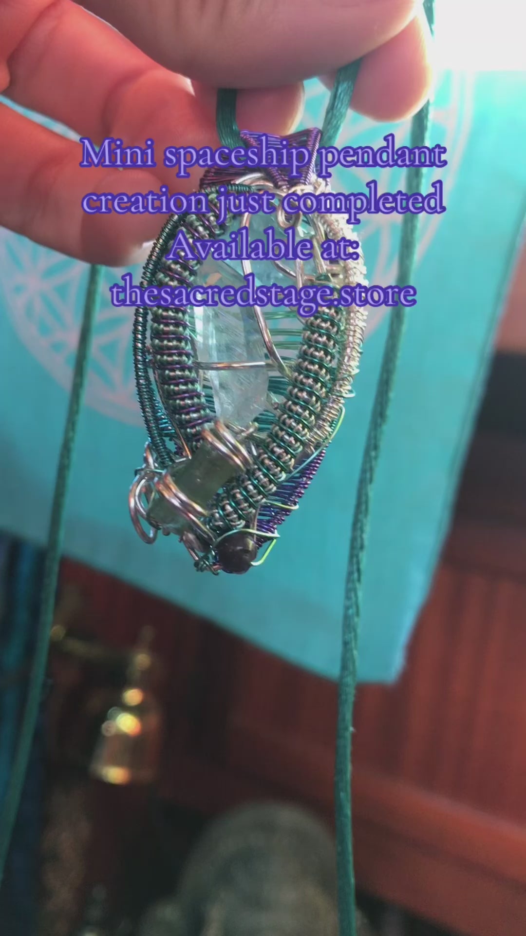 This mini spaceship pendant has a green tourmaline, a female quartz crystal point I dug out of the mountains outside Seattle Washington, aquamarine and a amethyst bead. It is hand weave with non-tarnish copper wire colors of silver blues and purple. This pendant was created with the intentions and is holding the frequency of aligning with your divine assignment here on earth now all of the gemstones Added are to assist you with being guided by your heart 💜 divine love, by clarity and divine communication To show up here now in full authenticity aligned with the highest and best version of yourself 🧬 💫