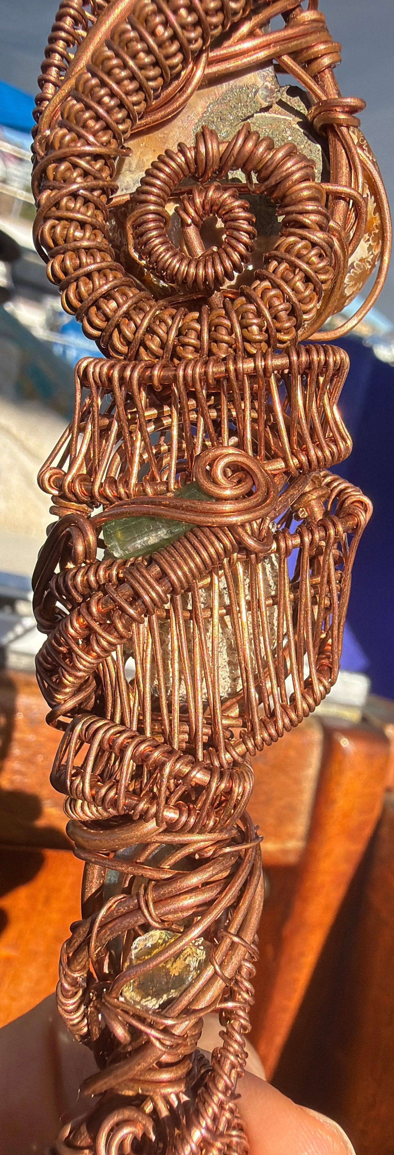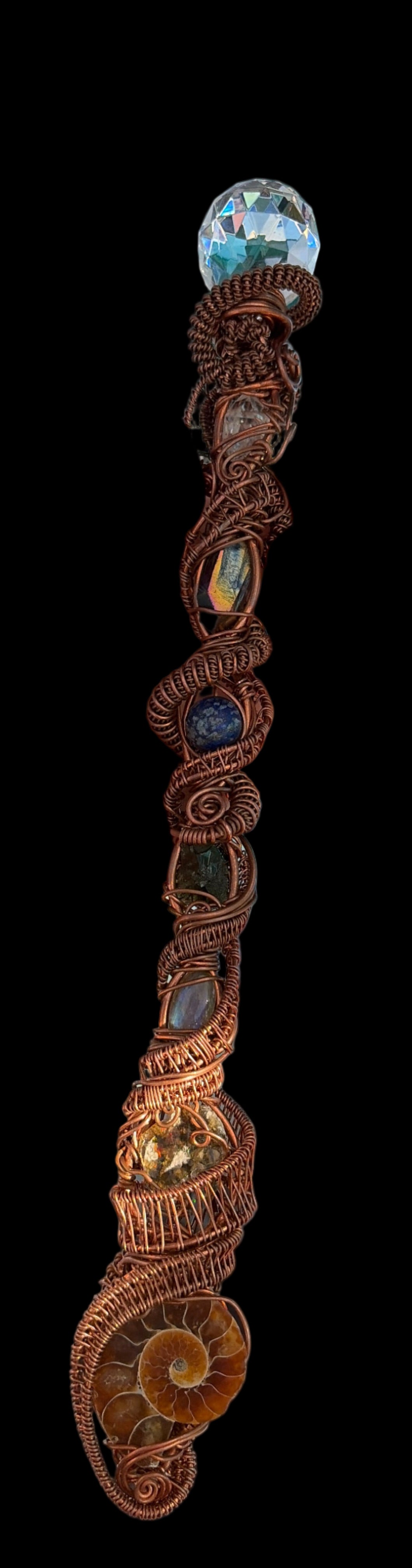 Handcrafted Copper DNA Helix Wand with Ammonite Fossil, Black Precious Opal, Labradorite, Moldavite, Lapis Lazuli, Titanium Quartz, and Payson Diamond, Green tourmaline & Australian opal yellow hues