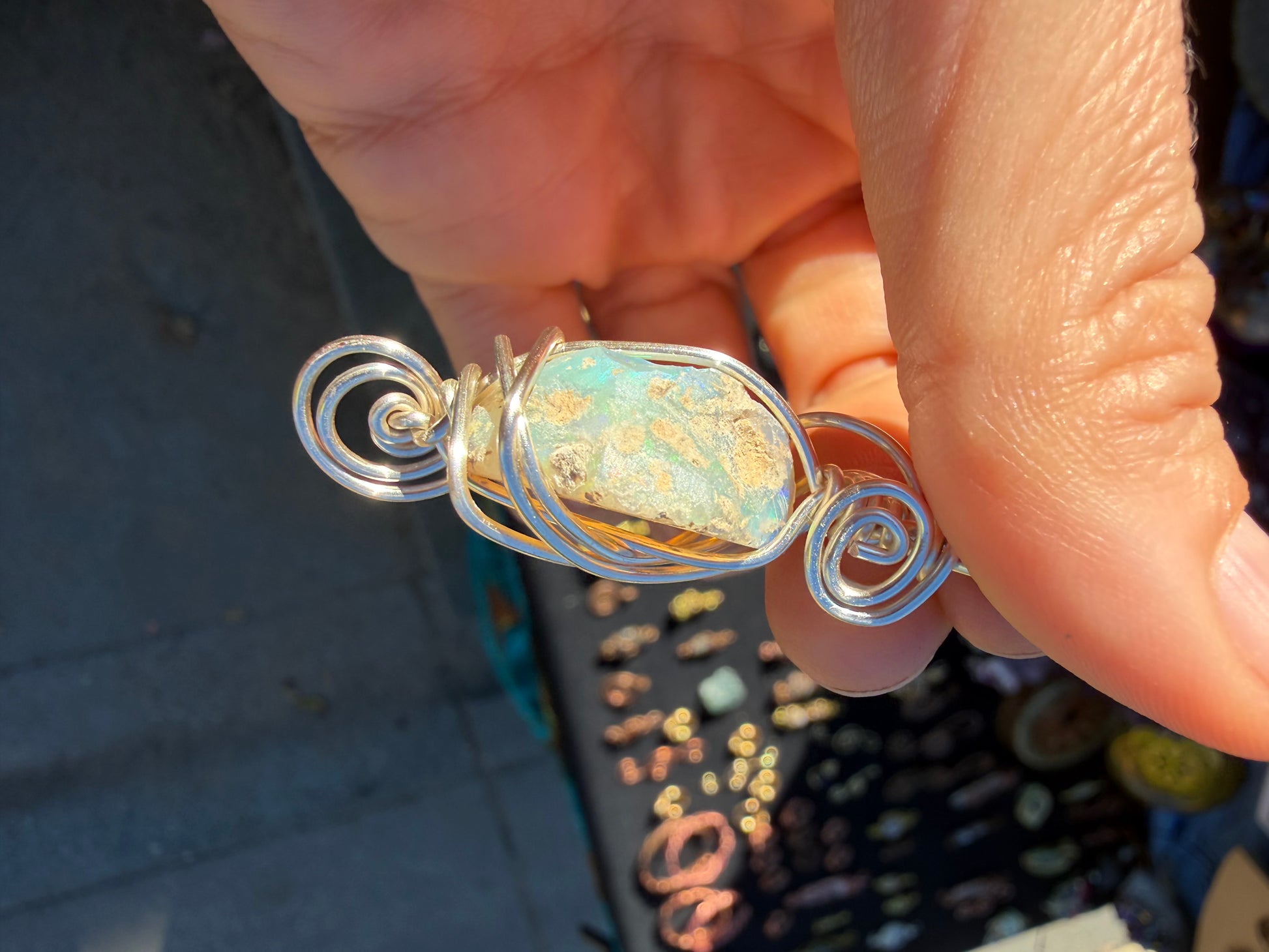 a gentle white stone resting quietly in its wire wrapped cradle.