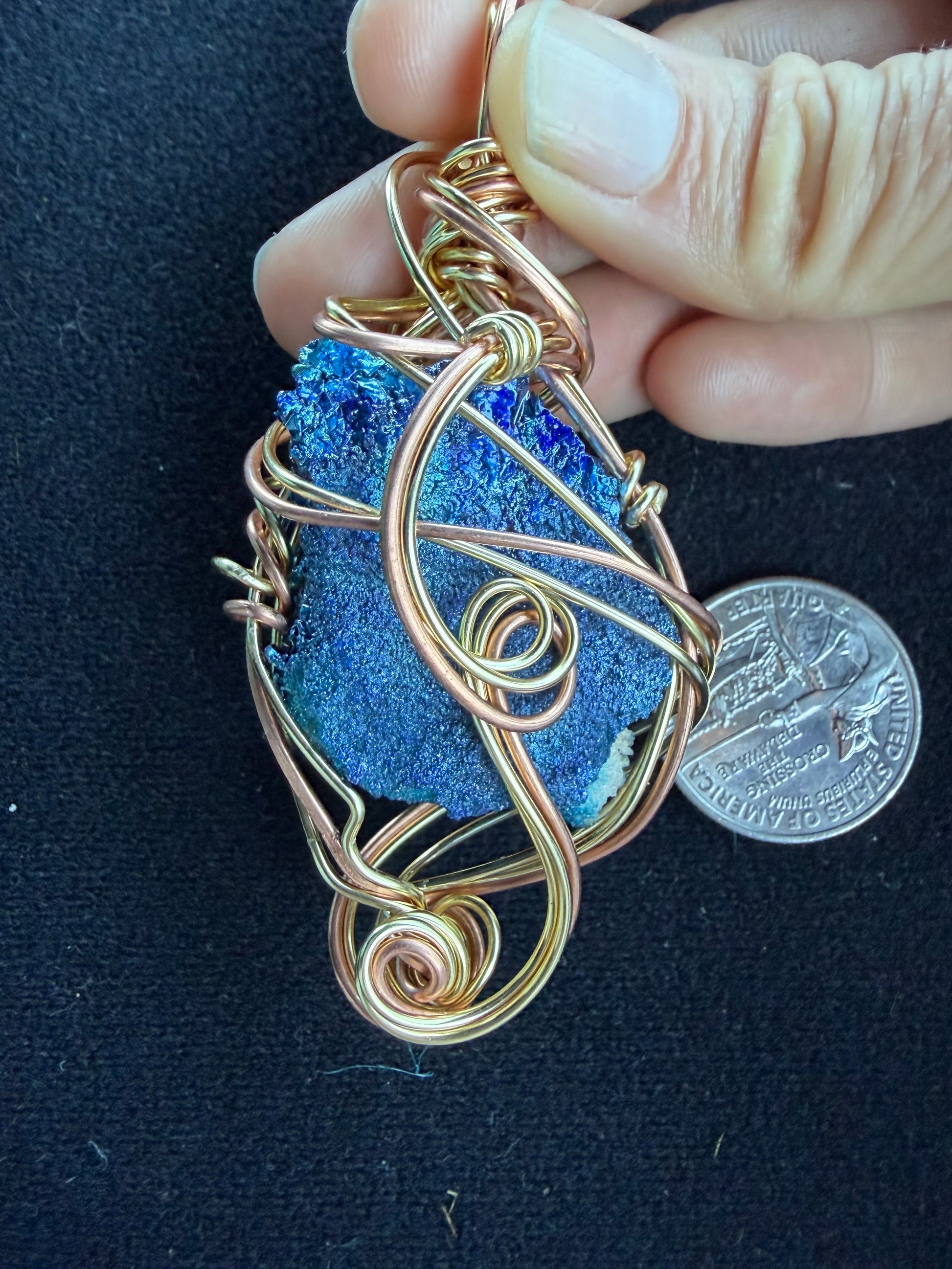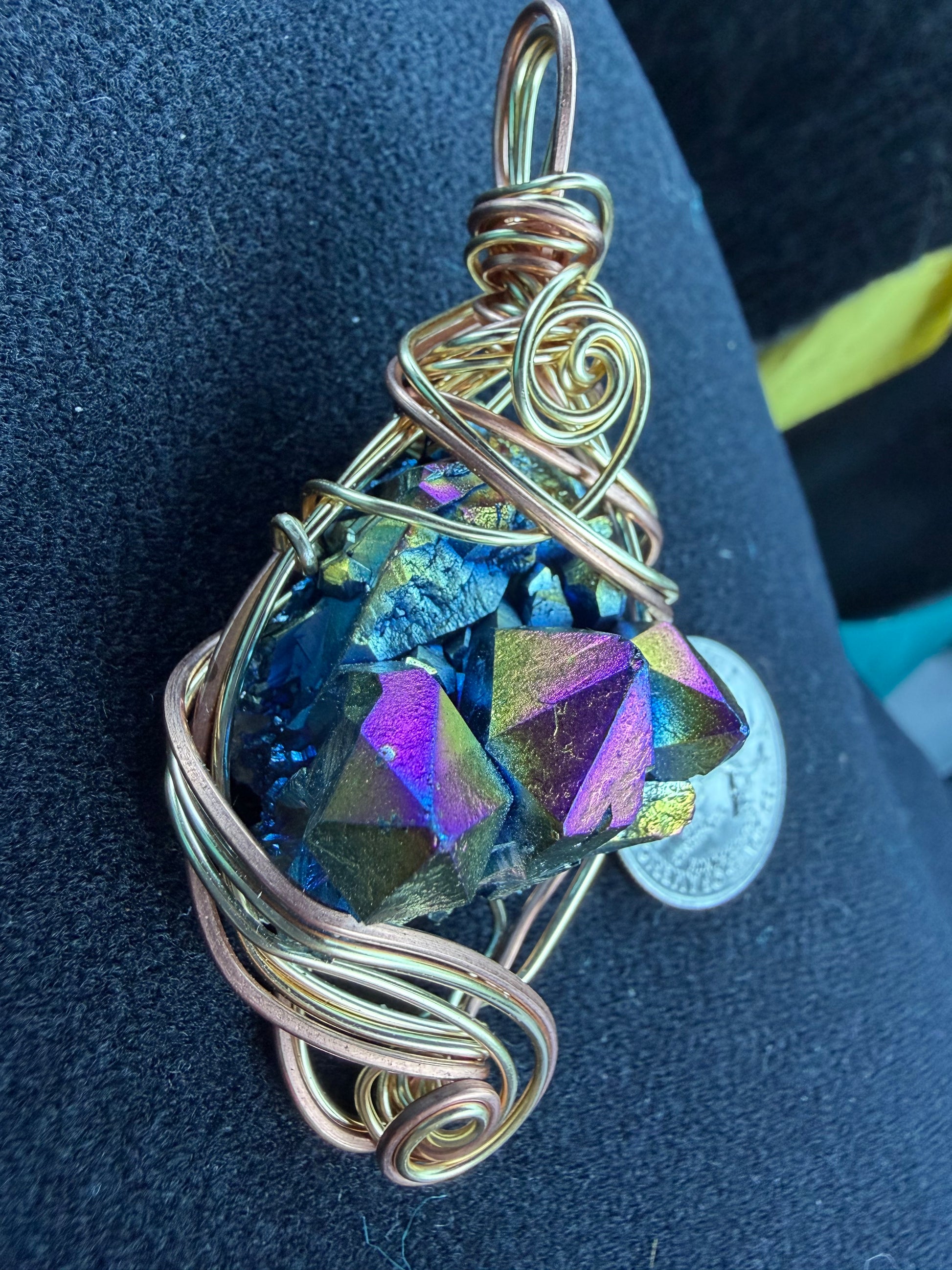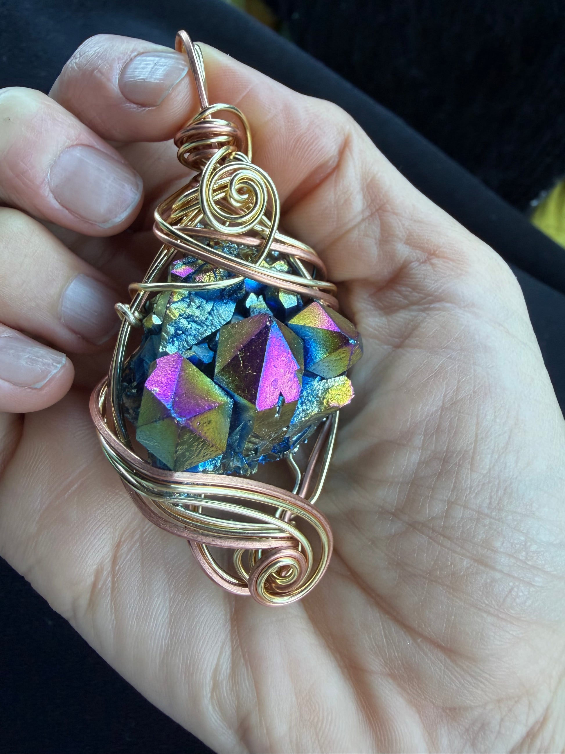 The brass wrapping adds warmth, strength, and vintage charm, complementing the crystal’s electric colors.