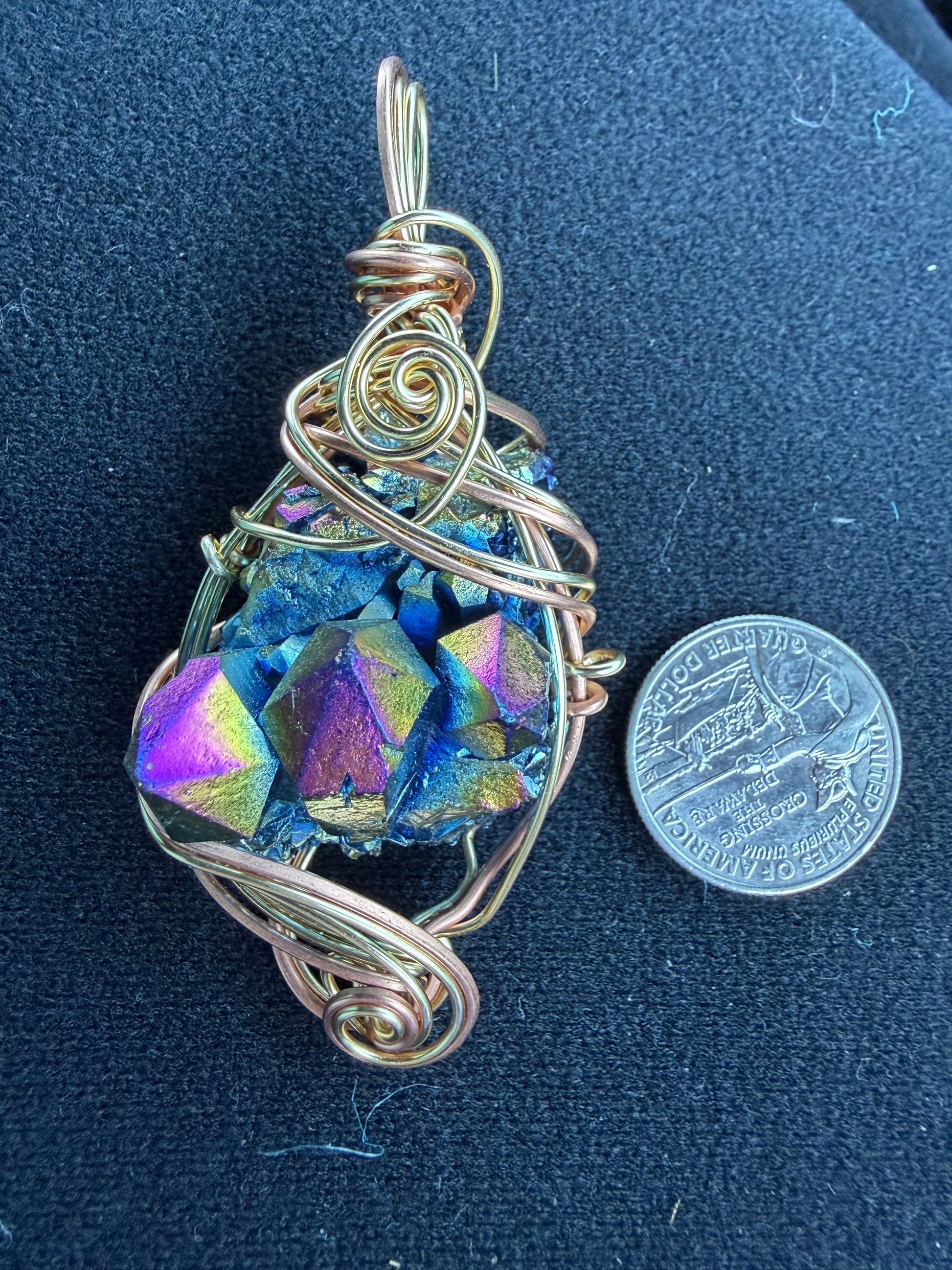 These vibrant Titanium Quartz clusters are hand-wrapped in warm, golden-toned brass wire, enhancing the crystal’s rainbow shine and bold metallic finish. Each cluster displays shimmering iridescent hues—blues, purples, golds, and greens—created through a fusion of natural quartz and titanium. The result is a striking, energetic piece that is both grounding and electrifying.
