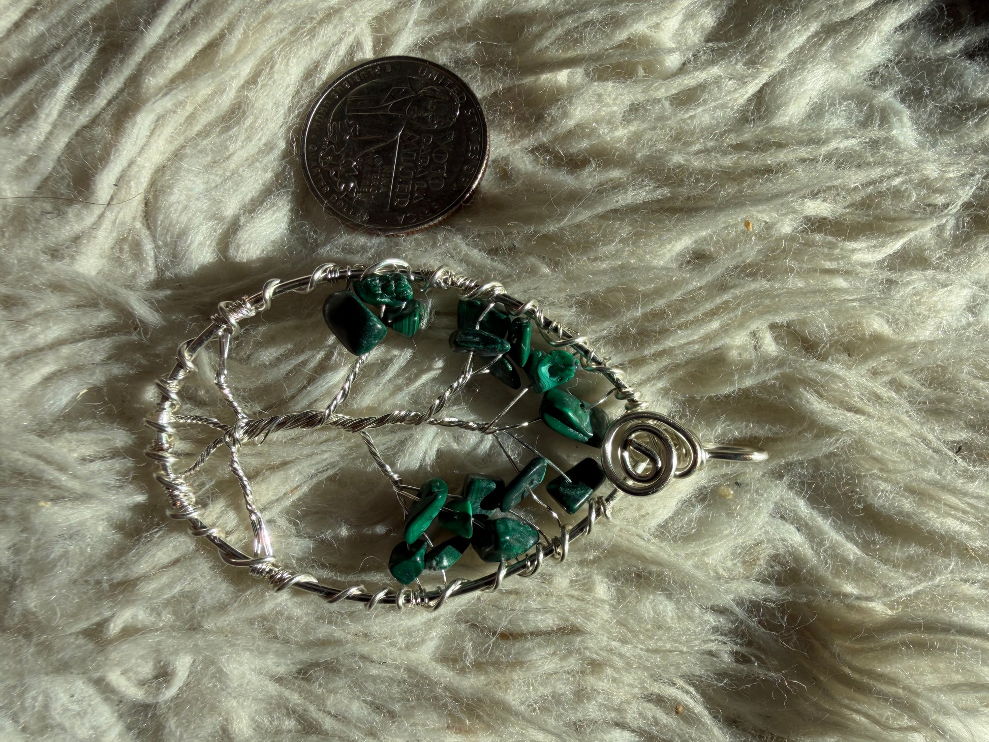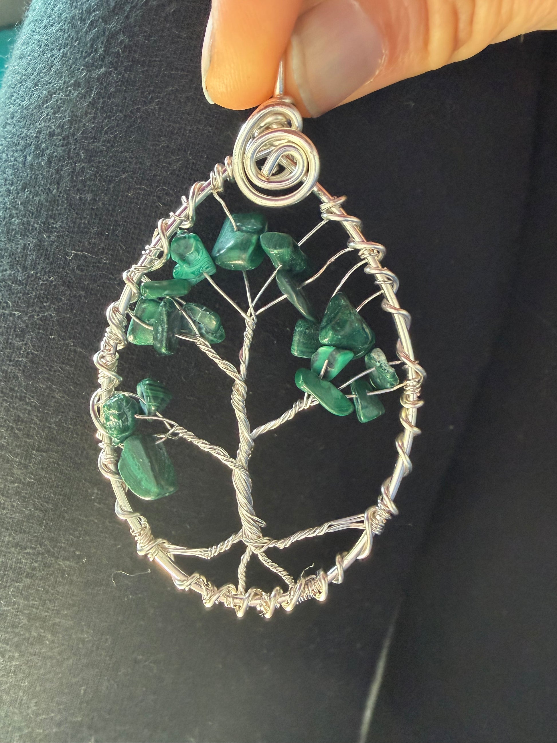 This Tree of Life pendant is crafted with silver-plated copper branches flowing around rich green Malachite. Malachite is known as a stone of transformation, courage, and heart-centered healing. Its swirling patterns hold the energy of growth, evolution, and emotional clearing a natural match for the Tree of Life symbol.