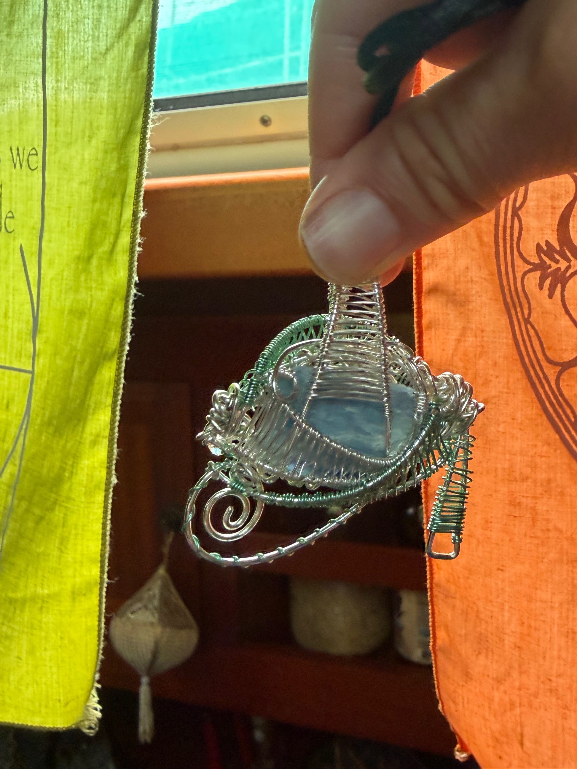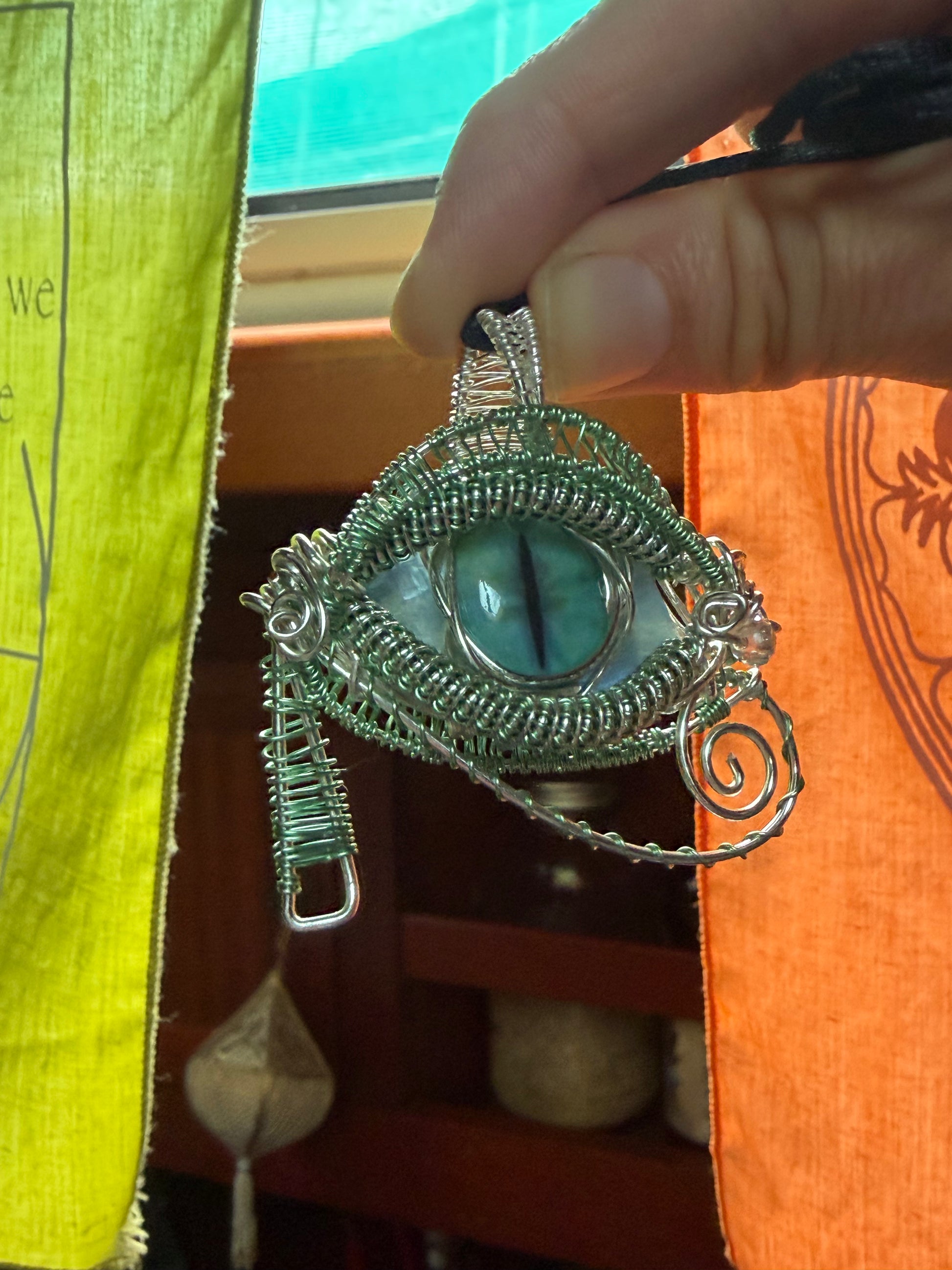 This was handcrafted and weave by me with colorful copper coated wire, Silver and seafoam the eye is made of resin with blue and green Hughes. There is a blue kyanite on the back, which is great for aligning all of your chakras.